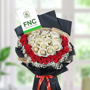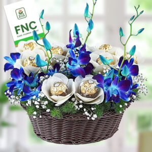 This elegant gift set includes 16 Ferrero Rocher chocolates, paired with 20 delicate pink roses and 6 vibrant purple orchids. All items are beautifully arranged in a brown oval cane basket (17.78 cm), creating a luxurious and thoughtful presentation perfect for any occasion.