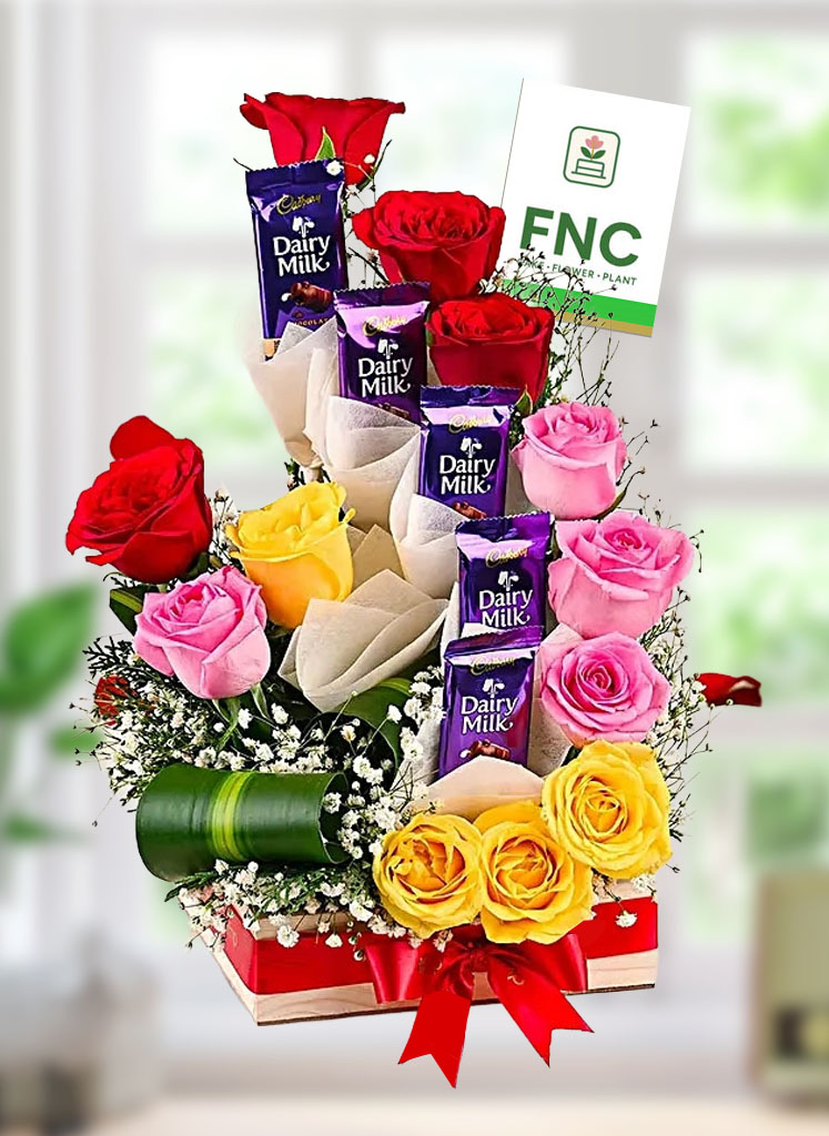Be the first to review “Dairy Milk N Roses Step Arrangement” Cancel reply