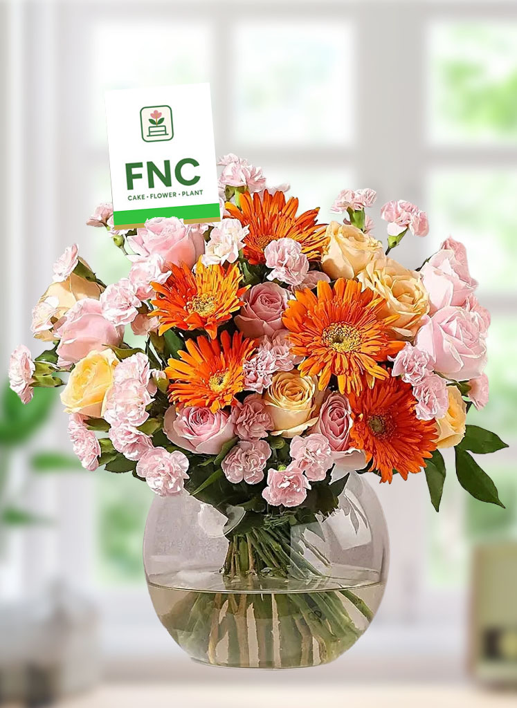 Bring joy to any celebration with this radiant floral arrangement. Bold Orange Gerberas, soft Peach Roses, and elegant Sweet Roses come together beautifully, complemented by charming Spray Pink Premium Carnations. Finished with lush Green Murraya Leaf Fillers and presented in a stylish glass vase, this bouquet adds a refreshing and vibrant touch to any space.